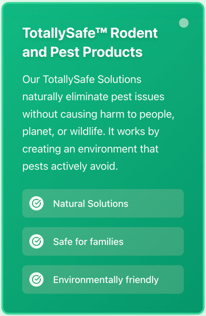 Eliminate rodent and other pest problems at the source with our organic, non-toxic, non chemical solutions that are Totally Safe for people, pets, and the planet.