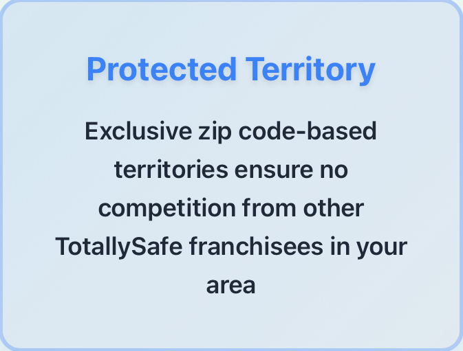 Each franchise receives exclusive rights to specific zip codes within their city, ensuring no competition from other TotallySafe franchisees in your area.